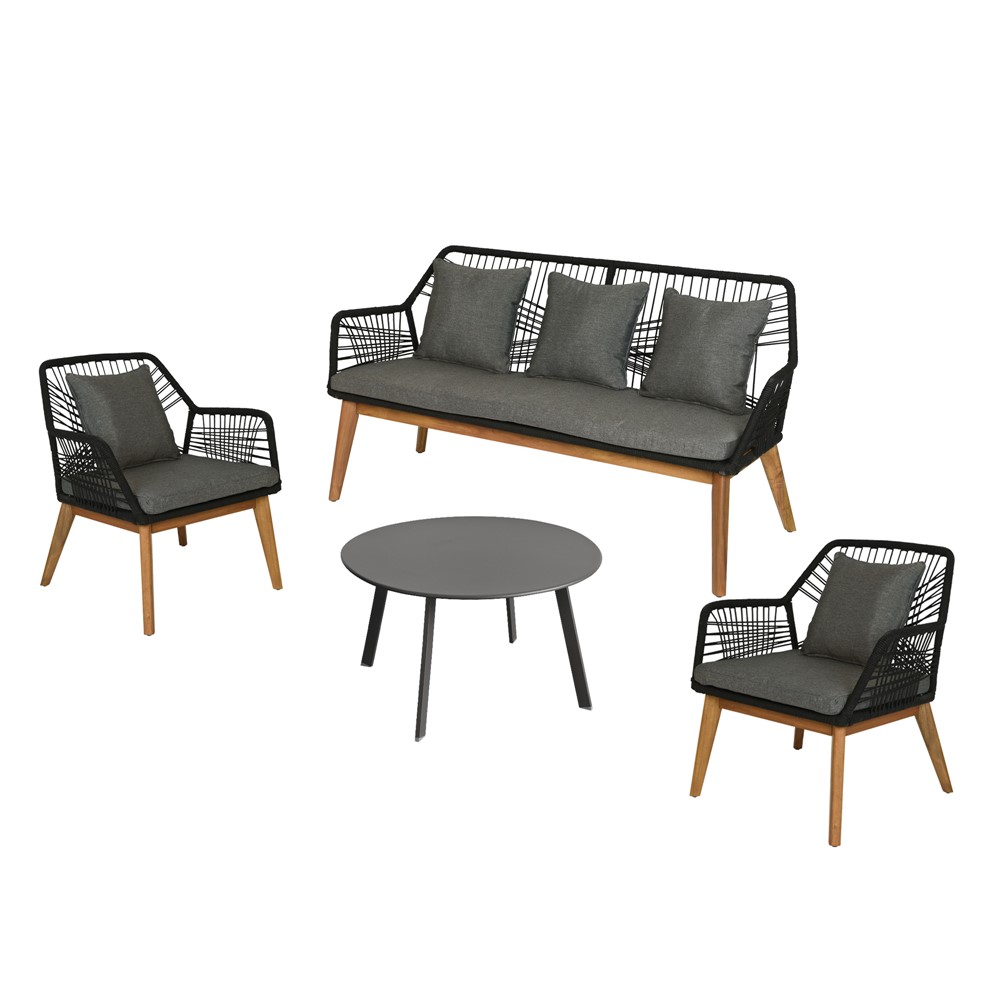 Seti me 2 poltrona me krahë dhe tavolinë mesi e rrumbullakët Sevilla është një nga setet tona të parapëlqyera. Ofron një kombinim perfekt materjalesh me strukturë druri dhe thurje me fije të forta sintetike. Thurjet në pjesën ulëse dhe mbështetëse janë elastike, shiltet janë poliestër kundra uji, duke ju ofruar kështu një rehati më të mirë. Dizajn shumë unik si dhe kombinim perfekt i ngjyrës së zezë me atë të drurit natyral. Shtresë lyerje mbrojtëse kundra dëmtimit ndaj rrezeve UV si dhe agjentëve atmosferik.