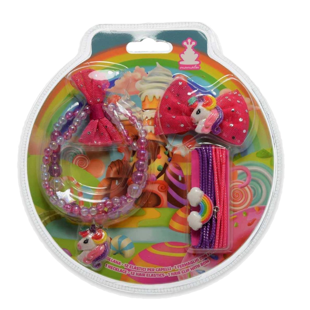 Set aksesorë flokësh + varëse, Unicorn, është një set që përfshin aksesorë për flokë dhe varëse, të dizenjuar posaçërisht me motive të Unicorn. Seti është në ngjyrën rozë dhe përmban 2 aksesorë për flokët dhe një varëse.