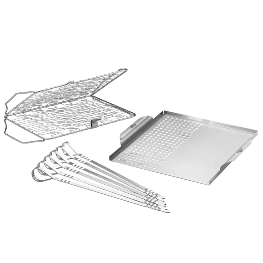 Set aksesorë pjekje për barbekju, prej material inoksi me 3 pjesë. Seti përmban një skarë me mbyllje, 6 hell kebabi inoksi dhe një tavë shumëfunksionale. Ky set shumëfunksional është ideal dhe tepër praktik për gatimet me barbekju.