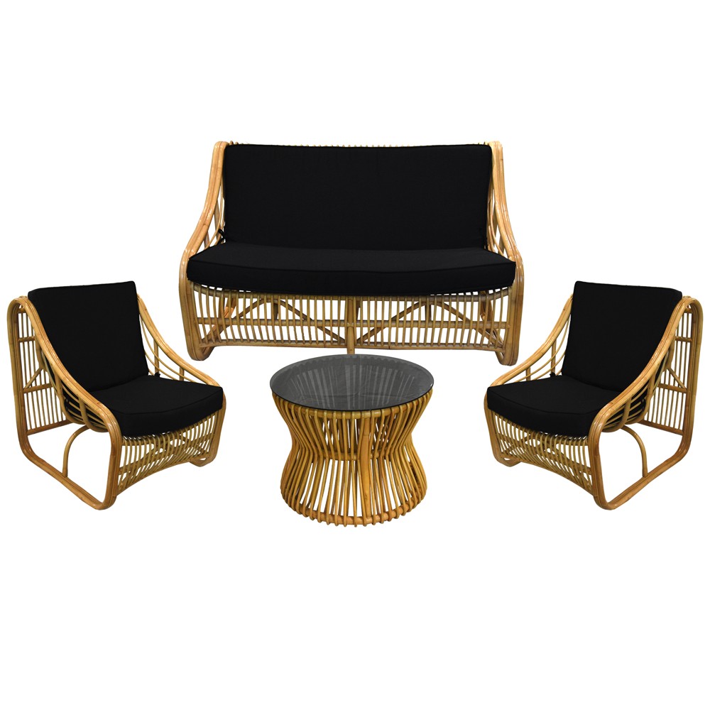 Set Boho Chick, 2 karrige + 1 kolltuk dopjo + 1 tavolinë, ratan, kafe / e zezë, 73x75xH87 / 136x75xH87 / 60x60xH47 cm