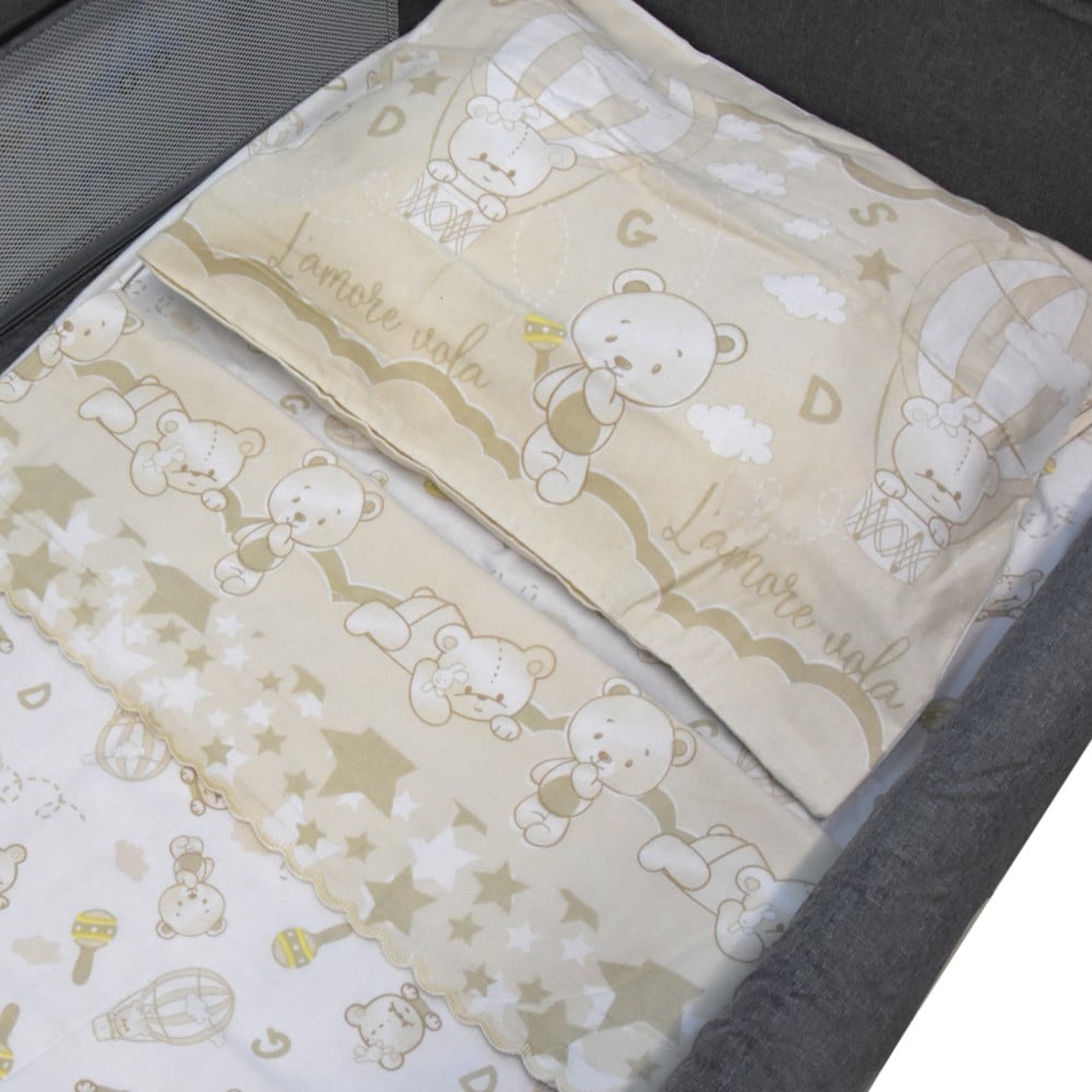 Seti I carcafëve për fëmijë I përbërë nga materiali 100% pambuk e bën këtë set të pakrahasueshëm dhe ideal për dhurata apo përdorim të përditshëm. Seti përfshin 3 pjesë: carcafi I poshtëm 65x130cm, carcafi I sipërm 120x180cm dhe këllëfi I jastëkut 40x60 cm, në ngjyrë bezhë me arusha.