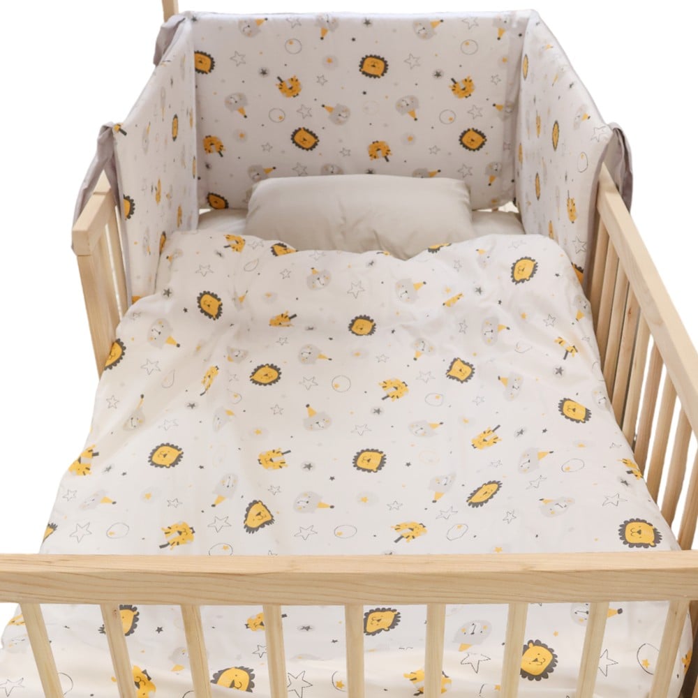 Ky set çarçafi për krevat femijesh është një zgjedhje e shkëlqyer për të krijuar një ambient të bukur dhe të këndshëm në dhomën e fëmijës. Dizajni i tij është i pasur me ngjyra, duke përfshirë elementë si luan. Seti përfshin një varietet të plotë të tekstileve për krevat duke siguruar një pajisje të plotë për shtratin e fëmijës. I pershtatshem per krevatin me kod 7810803.