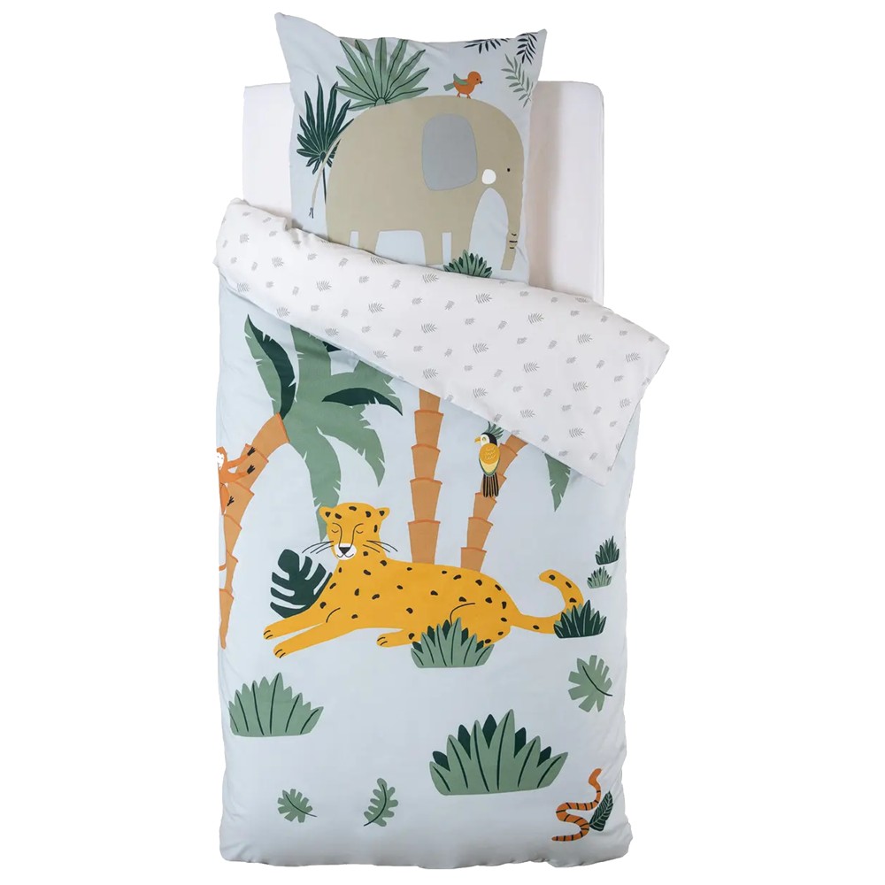 Set carcaf për fëmijë, prej material pambuku antialergjik. Seti përmban një këllëf jorgani dhe një këllëf jastëku, në ngjyrë mikse me dizenjo xhungle, në përmasë 200x140 cm.