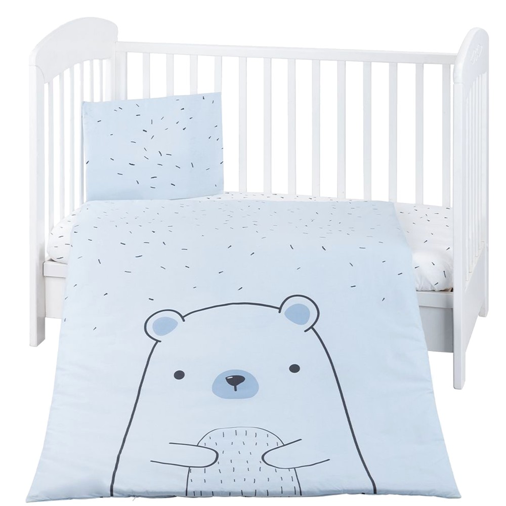 Set carcafësh për krevat bebesh, prej material 100% pambuk, në ngjyrë blu. Seti përmban një këllëf jastëku 35x45 cm, një carcaf të poshtëm 100x150 cm, si dhe mbulesa e jorganit 95x135 cm.