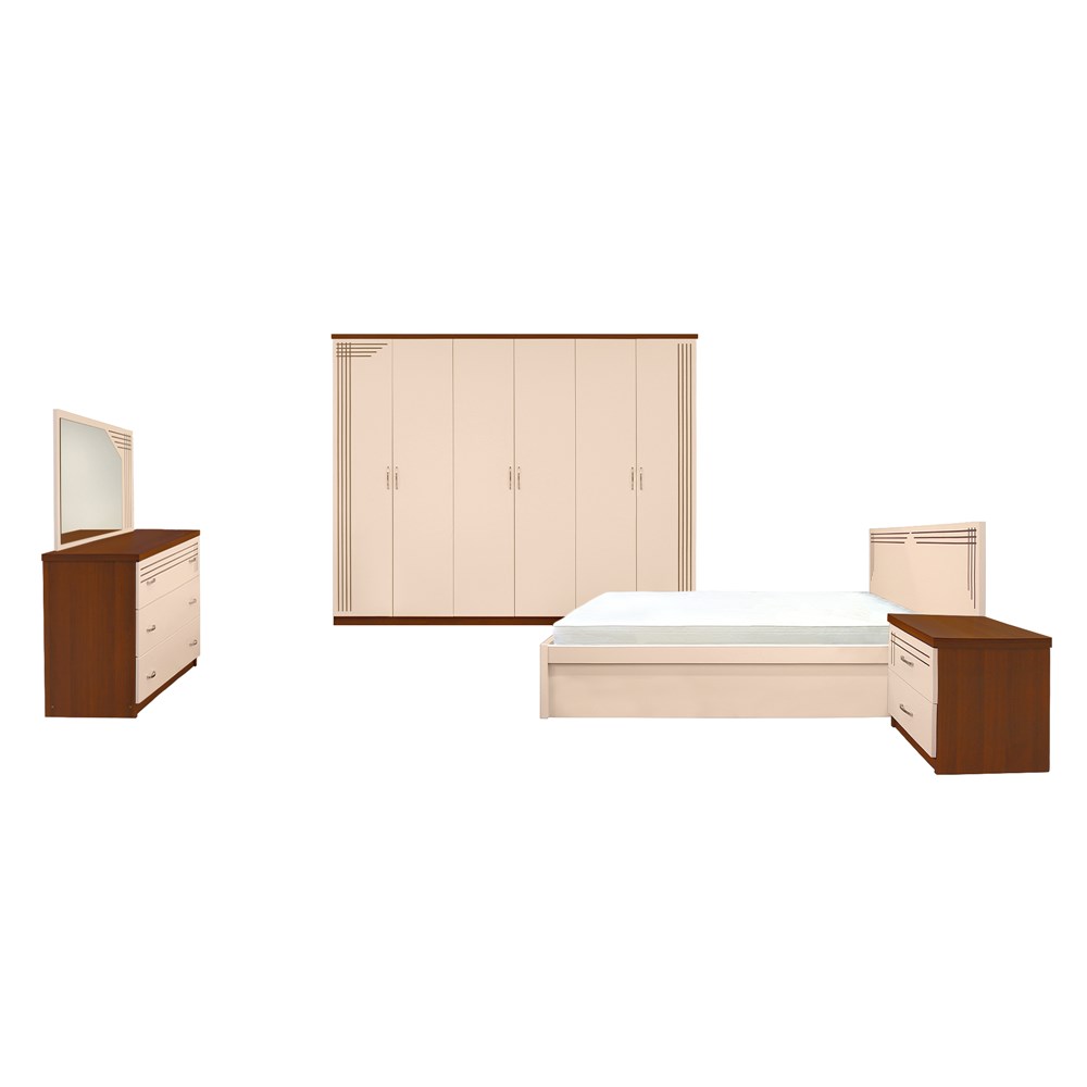 Seti i dhomës së gjumit MESINA e mrekuellueshme, bie në sy për dhomën tuaj . Kjo dhomë gjumi ofron një zgjidhje elegante magazinimi për një buxhet të vogël. E ndërtuar nga një struktur melamine dhe finitur qershie dhe pana. Kjo dhomë gjumi përbëhet nga një komo me 3- sirtarë, 2 komodina, krevati dhe dollapi me 6-dyer. Dollapi me 6 dyer ka hapësira të bollshme magazinimi që mundëson ruajtjen lehtësisht këmishave, xhaketave dhe veshjeve të tjera. Komoja ka 3- sirtarë për magazinimin e sendeve tuaja personale, dhe pjesa e sipërme mund të përdoret për vendosjen mbi të televizorin apo stolitë e ndryshme. Komodina do të shërbejë për vendosjen e një llambe dhe orë me zile ndërsa hapësira shtesë sirtari do të shërbejë për mbajtjen e aksesorëve që ju duhen pranë krevatit. Krevati me kokën e lartë ofruar një përzierje të mirë të mbështetjes së fortë dhe rehatis maksimale.