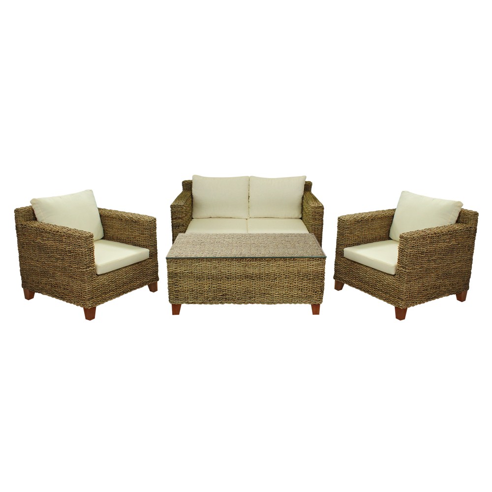 Seti me thurje natyrale ratanit, i përbërë nga tavolina me syprinën e xhamit dy karrige dhe nje kolltuk dysh, është një zgjedhje ideale për të mobiluar ambientet e hapura të bareve, verandave, tarracave, ballkoneve etj. Skeleti i qendrueshem prej druri siguron qendrueshmërinë dhe jetëgjatësinë është veshur me materialin e ratanit natyral . Forma elegante e këtij seti me motivet ritmike , përdorur në kompozimin e elementit të mbështetjes te karriget si dhe në konturin e sipërm të vendosur në tavolinë, shtojnë hijeshinë e këtij seti duke e bërë lehtësisht të përshtatshem për ambiente klasike të kopshtit tuaj. Ngjyra kafe e këtij seti përshtatet lehtë me të gjitha nuancat e ngjyrave veçanërisht me ngjyrat e hapura të mureve dhe aksesorëve të kopshtit tuaj dhe mjaft mirë me ambientet e gjelbëruara.