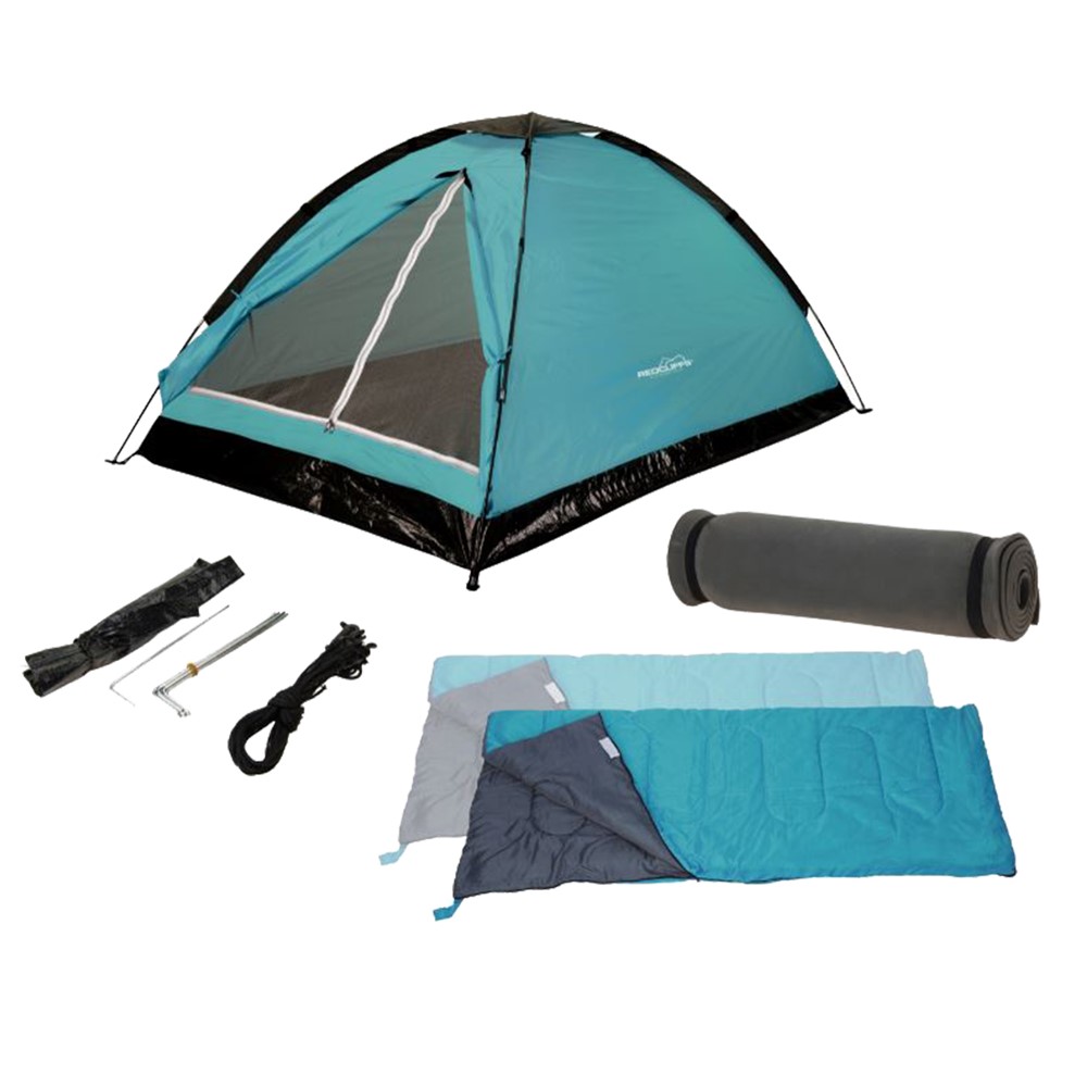 Set kampingu, i cili përmban një tendë për kamping, prej materiali najloni rezistent ndaj ujit dhe me suport prej fibrash karboni, me përmasa 120x200x100 cm, dy dyshekë kampingu, në formë zarfi me zinxhir, me mbushje poliestre të butë dhe me përmasa 180x74 cm, dy shtroja për dyshekë kampingu, me përmasa 180x50x0.7 cm, litarë dhe kunja fiksuese për montimin e tendës. Tenda është e pajisur me një shtresë të jashtme me zinxhir në pjesën e përparme dhe me një shtresë rrjete, e cila përdoret gjatë verës për të ndaluar hyrjen e insekteve të ndryshme në tendë. Tenda ka sistem montimi manual, me shufra të cilat janë të përbëra nga material rezistent ndaj përkuljes. Shufrat e suportit montohen tek pjesa e tendës dhe vendosen tek mbajtëset fiksuese në 4 cepat e tendës. Rekomandohet që në pjesën e poshtme të vendoset një shtresë mbrojtëse (kodi 782119), kundër gurëve dhe lagështisë. Ky produkt është i përshtatshvm për përdorim nga dy persona.