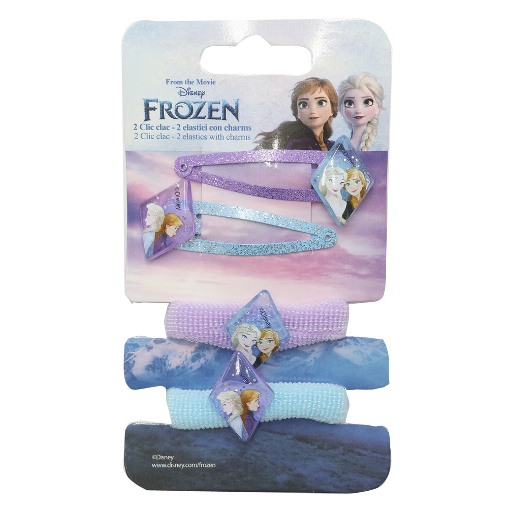 Set kapëse dhe llastik flokësh, Frozen II është një set që përfshin kapëse dhe llastikë flokësh të dizajnuar me motive të personazheve të Frozen II. Seti vjen në kombinimin e ngjyrave bojëqiell dhe lejla. Ky produkt është i përshtatshëm për fëmijët që duan të kenë kapëse dhe llastikë flokësh me motive të personazheve të Frozen II.