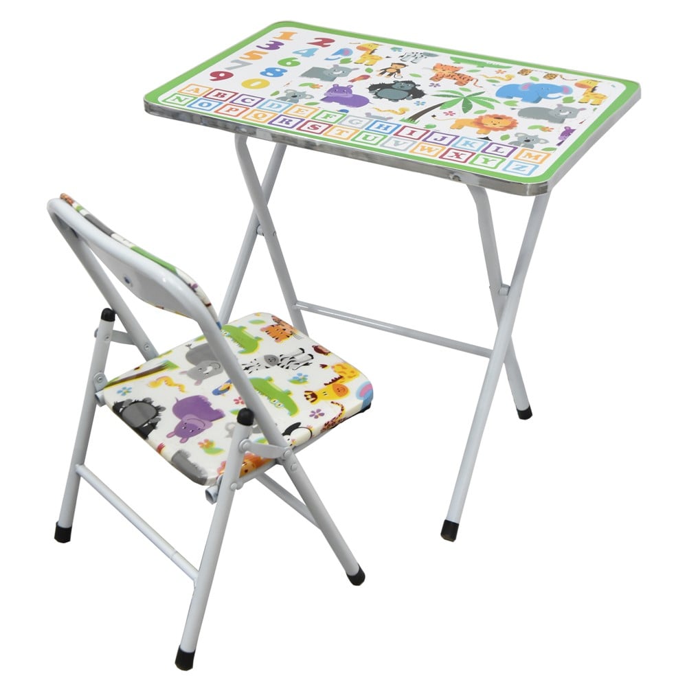 Set për fëmijë, i cili përfshin një tavolinë me përmasa 63x40x51.5 cm dhe një karrige me përmasa 27.5x27.5x26 cm, me strukturë prej materiali hekuri rezistent, me ndenjëse dhe mbështetëse prej materiali PVC-je, në ngjyrë të bardhë, me dizajn Jungle. Tavolina është e pajisur me printime të shkronjave të alfabetit dhe numrave në sipërfaqe, që shërbejnë për të ndihmuar fëmijët e vegjël që të zhvillojnë memorien e tyre dhe aftësitë e tyre numerike dhe analitike. Ky produkt është i përshtatshëm për përdorim nga fëmijë të moshës mbi 4 vjeç.