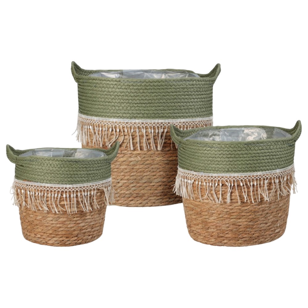 Set elegant me 3 kosha magazinimi, ideal për organizim praktik dhe dekorativ në çdo ambient të shtëpisë. Të punuara nga ratan natyral me detaje tekstili, këto kosha kombinojnë qëndrueshmërinë me një stil të ngrohtë dhe natyral. Ngjyrat jeshile dhe kafe i japin një pamje harmonike që përshtatet lehtësisht me ambiente moderne apo klasike. Të përshtatshme për magazinimin e rrobave, lodrave, aksesorëve apo sendeve të përditshme.