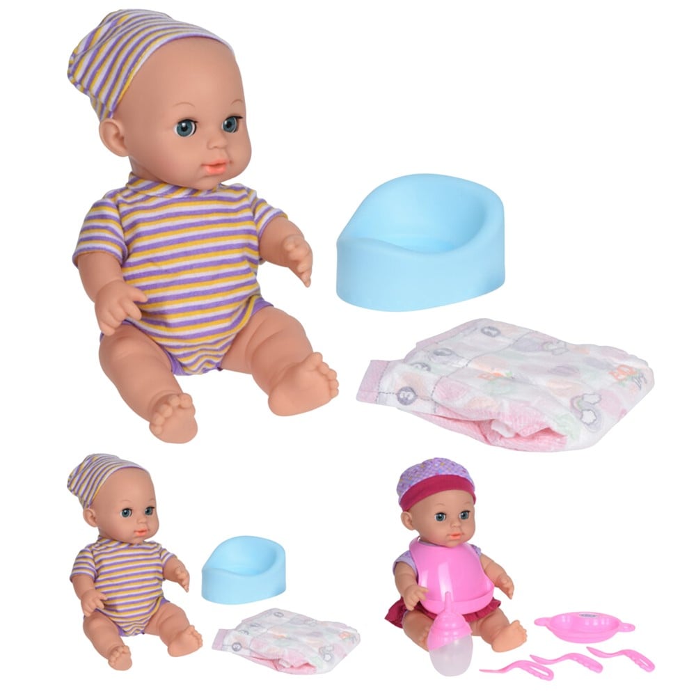 Set lodër për vajza, i cili përfshin një kukull bebe dhe aksesorë të ndryshëm, prej materiali plastik, me veshje prej materiali poliestre sintetike, në ngjyra të ndryshme. Kjo lodër ndihmon në zhvillimin e imagjinatës, zhvillimin e shqisave dhe zhvillimin e aftësive të të mësuarit tek fëmijët, përmes lojës në role. Materali përbërës dhe boja nuk kanë përmbajtje toksike apo të dëmshme për fëmijët dhe janë të çertifikuara për siguri në përdorim. Ky produkt është i përshtatshëm për fëmijë mbi 3 vjeç.
