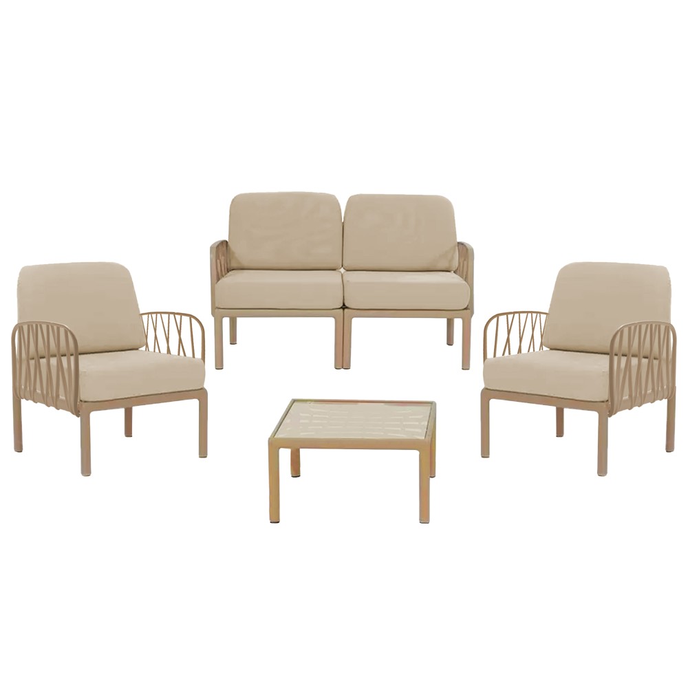 Set Luna, 2 karrige teke + 1 kolltuk dopjo + 1 tavolinë suprin qelqi, PP, kapuçino, 129x64.5xH75 / 68x64.5xH75 / 61.5xH44 cm