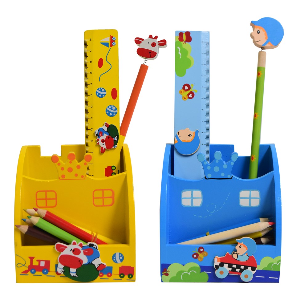 Set mbajtëse kancelarie me aksesorë për fëmijë, i cili përfshin një mbajtëse kancelarie, 5 lapsa të vegjël me ngjyra, një vizore dhe një laps grafiti me zbukurim. Mbajtësja është e pajisur me tre ndarje për vendosjen e aksesorëve dhe ka ngjyra dhe figura të ndryshme. Përdoret për t'u vendosur mbi sipërfaqet e tavolinave të studimit, për të organizuar hapësirat e kufizuara dhe si objekt dekorues. Ky produkt është i përshtatshëm për përdorim nga fëmijë të moshës mbi 3 vjeç.