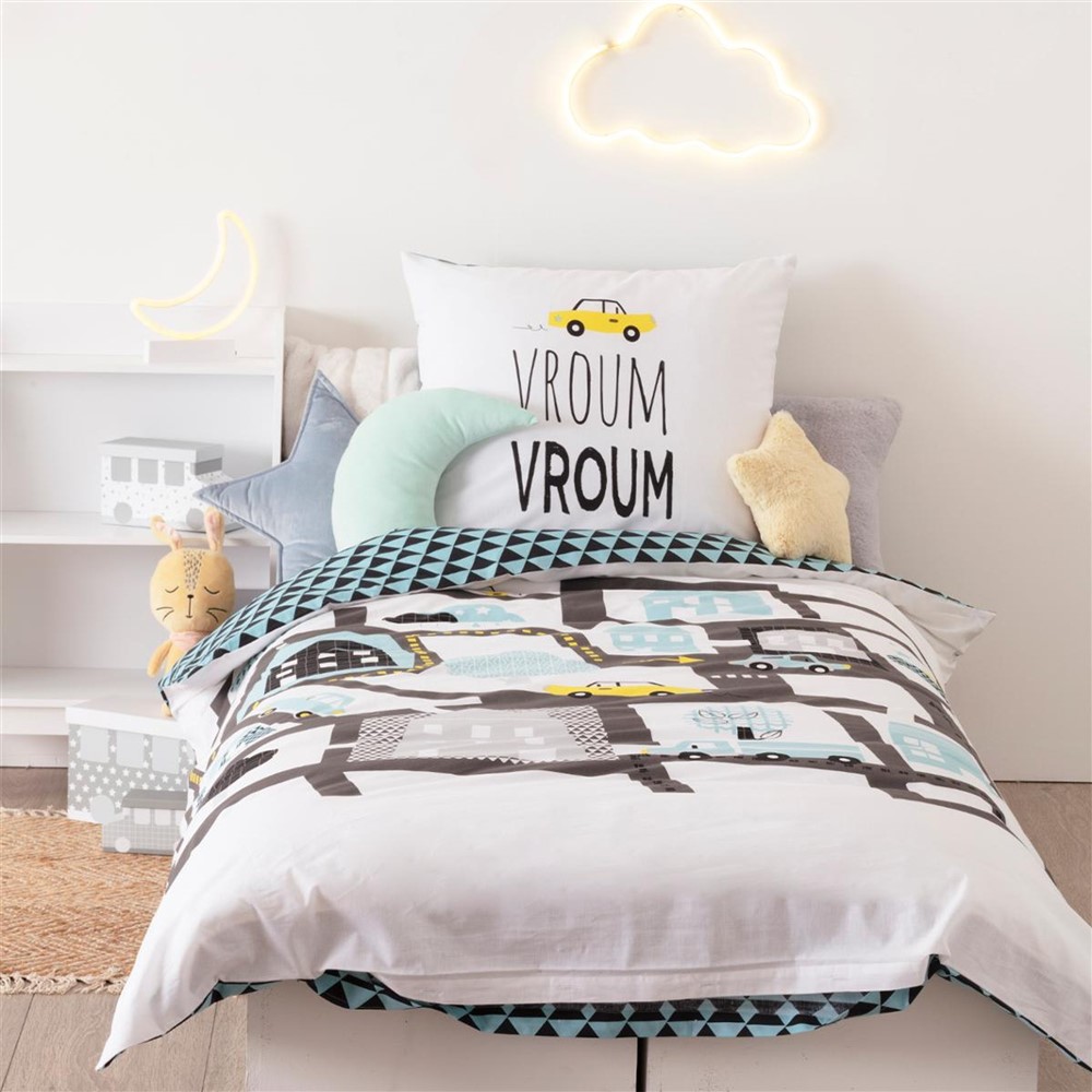 Set mbulesë krevati. Mbulesa që do t’i pëlqejnë shumë garuesve të vegjël të shtëpisë. Përmasat - mbulesa : gjatësia 200 x 140 gjerësia cm. Jastëk 65x65cm. Bërë nga materiali 100% pambuk dhe me printim të figurave. E kthyeshme, mund të përdoret nga pjesën e printimit ose në anën tjetër.