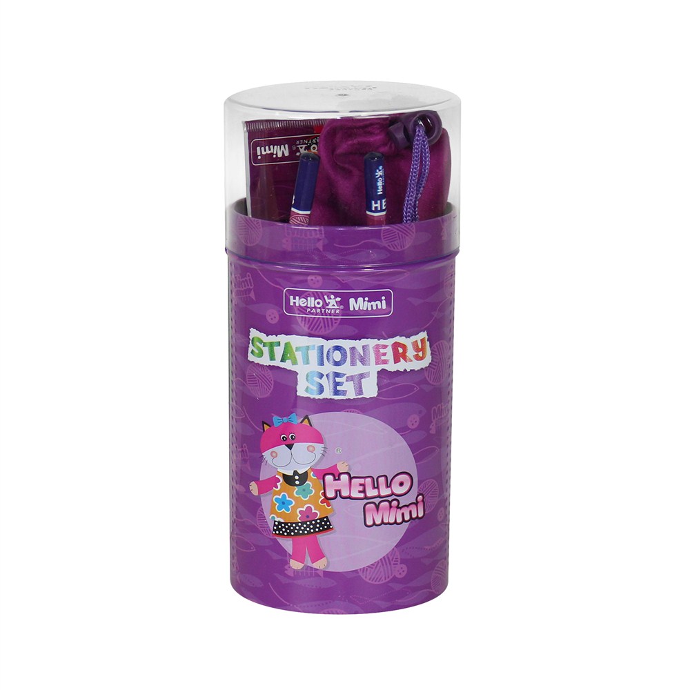 Set me aksesorë kancelarie për fëmijë, i cili përfshin një kuletë për mbajtjen e aksesorëve të ndryshëm, 2 lapsa grafiti, 12 lapsa me ngjyra, një ngjitës stick, një vizore, një mprehëse për lapsat, stikera të ndryshëm, një gomë dhe një palë gërshërë. Ky produkt është i përshtatshëm për fëmijë mbi 4 vjeç.