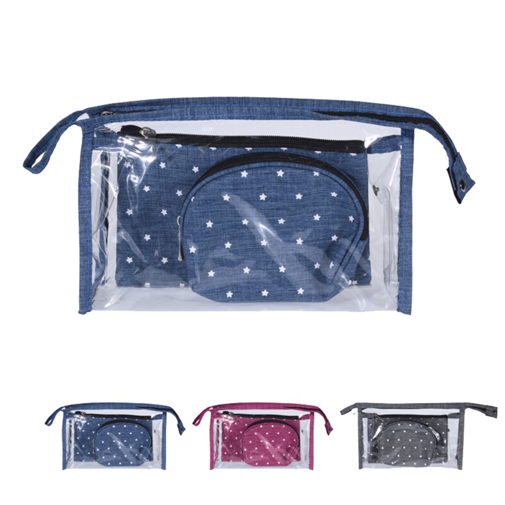Set me çanta kozmetike, i cili përmban një çantë kozmetike transparente, prej materiali polivinili, me përmasa 24.5x16x7.5 cm, dhe 2 çanta kozmetike të vogla, prej materiali poliestre, të pajisura me zinxhir, me përmasa 19.5x13 cm dhe 14x11.5 cm, në ngjyra të ndryshme. Seti përdoret për ruajtjen dhe mbajtjen e produkteve të ndryshme kozmetike dhe produkteve të higjienës personale, si kremra, shampo, produkte makeup-i, parfume, locione të ndryshme apo aksesorë të tjerë, si dhe për organizimin e tyre në çantat e udhëtimit. Ky produkt është i lehtë dhe ka përmasa kompakte, që e bëjnë të përshtatshëm për t'u marrë me vete në udhëtime.