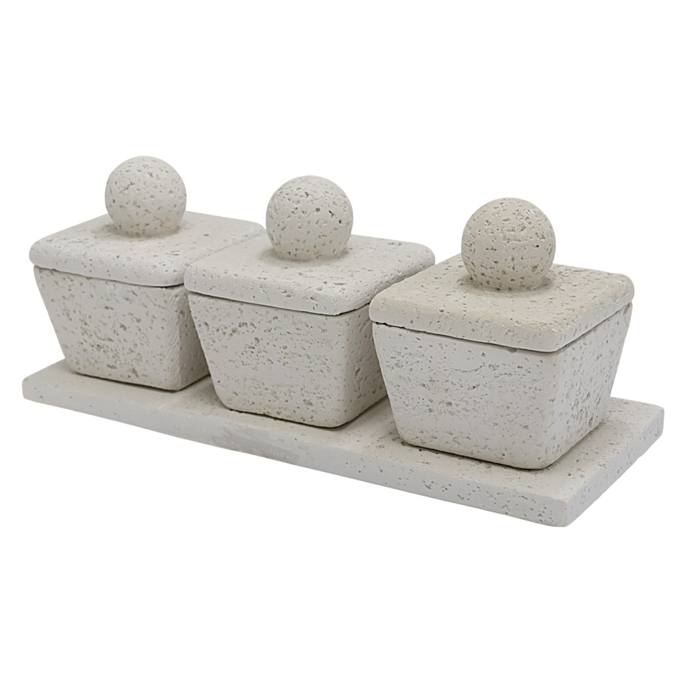 Ky set me mbajtëse erëzash prej qeramike, në ngjyrë të bardhë elegante, është ideal për organizimin dhe servirjen e erëzave në kuzhinë. Me përmasa 30x12 cm, ai ofron hapësirë të mjaftueshme dhe një paraqitje të rregullt, duke kombinuar funksionalitetin me estetikën moderne. Qeramika e cilësisë së lartë garanton qëndrueshmëri dhe lehtësi në pastrim, ndërsa dizajni i thjeshtë dhe i pastër e bën këtë set të përshtatshëm si për përdorim të përditshëm, ashtu edhe për ambiente profesionale.