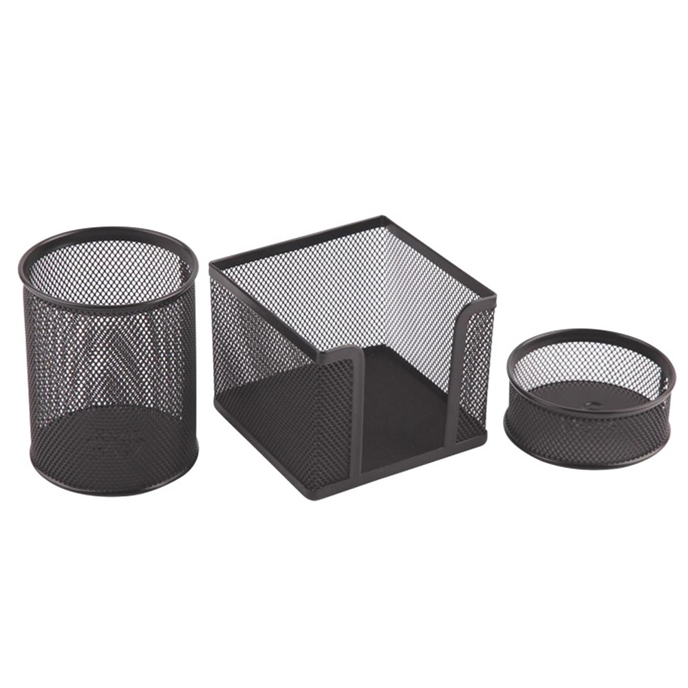 Set me mbajtëse për aksesorë kancelarie, I cili përmban një mbajtëse letrash shënimesh, një mbajtëse stilolapsash dhe një mbajtëse kapëse letrash, të përbëra prej materiali rrjete metalike, në ngjyra të ndryshme. Përdoren për të bërë aksesorët e ndryshëm lehtësisht të aksesueshëm, duke ndihmuar në organizimin e hapësirës së kufizuar në tavolinat e studimit, zyrat, studiot, etj.