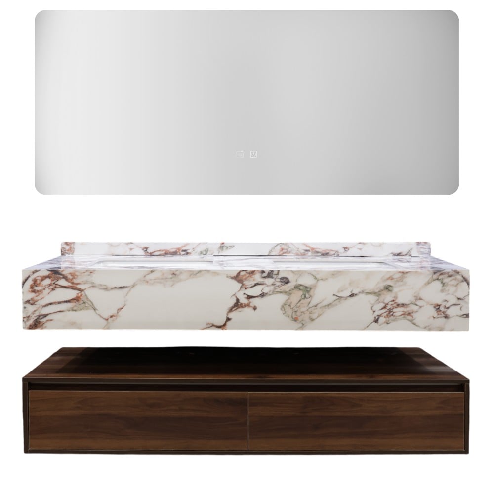 Seti përfshin: Mobilje e sipërme me 2 lavamanë të integruar, Mobilje e poshtme me 2 sirtarë, Pasqyre LED