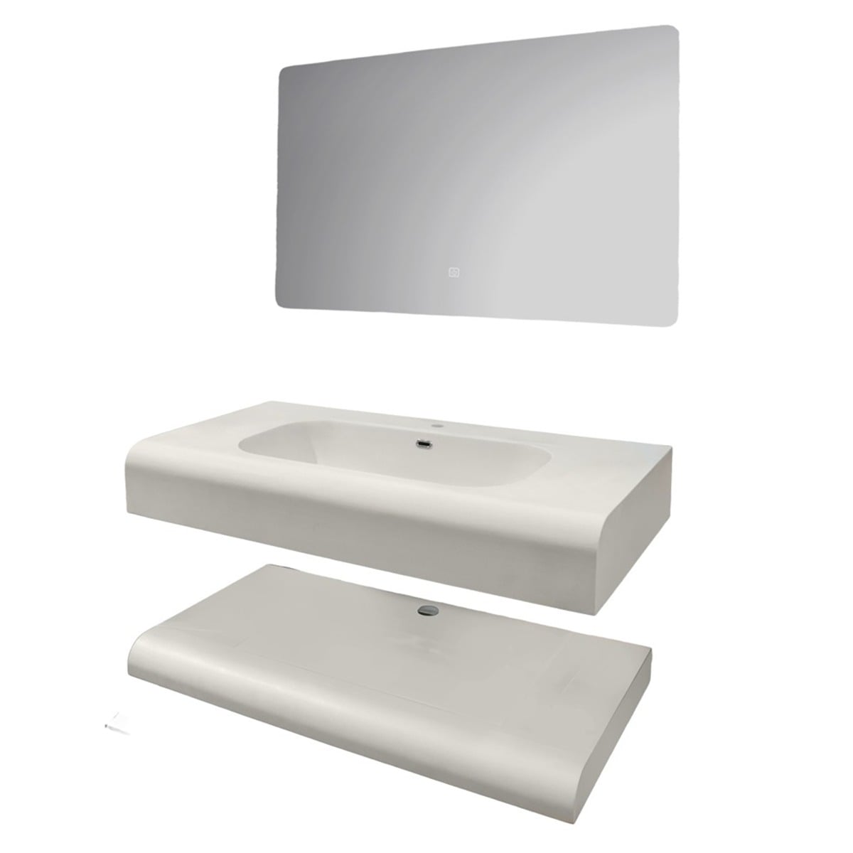 Po vlerësoni:Set mobilje tualeti, me montim në mur, gur i sintetizuar, Përmasat: W 100 cm x D 50 cm x H 15 cm. Pasqyra LED: W 100 cm x H 60 cm