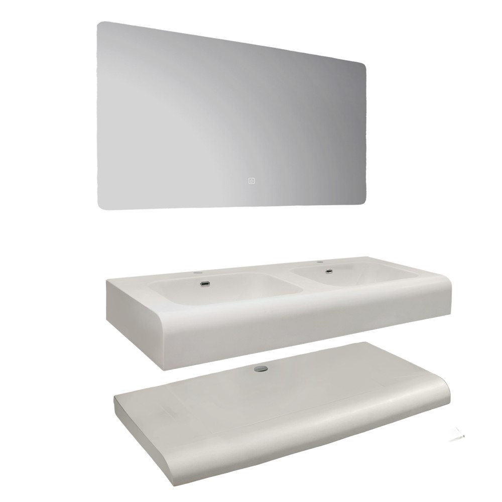 Set mobilje tualeti me montim në mur, i ndërtuar nga material gur i sintetizuar, duke ofruar një strukturë të qëndrueshme dhe rezistente ndaj lagështirës. Me përmasa W 120 cm x D 50 cm x H 15 cm dhe ngjyrë të bardhë të pastër, ky set është i përshtatshëm për çdo hapësirë, duke ofruar funksionalitet dhe një pamje moderne. Pasqyra LED ka përmasa W 120 cm x H 60 cm, dhe është projektuar për t'u integruar në mënyrë të përshtatshme me bangon, duke krijuar një pamje të pastër dhe të organizuar. Gjithashtu hapësira midis dy bangove mund të përdoret për të organizuar peshqirë, ose elementë të tjerë të domosdoshëm në tualet. Ky dizajn i montuar në mur kursen hapësirë dhe lehtëson pastrimin e zonës poshtë bangos, duke kontribuar në një ambient tualeti më të pastër dhe më të rregullt.