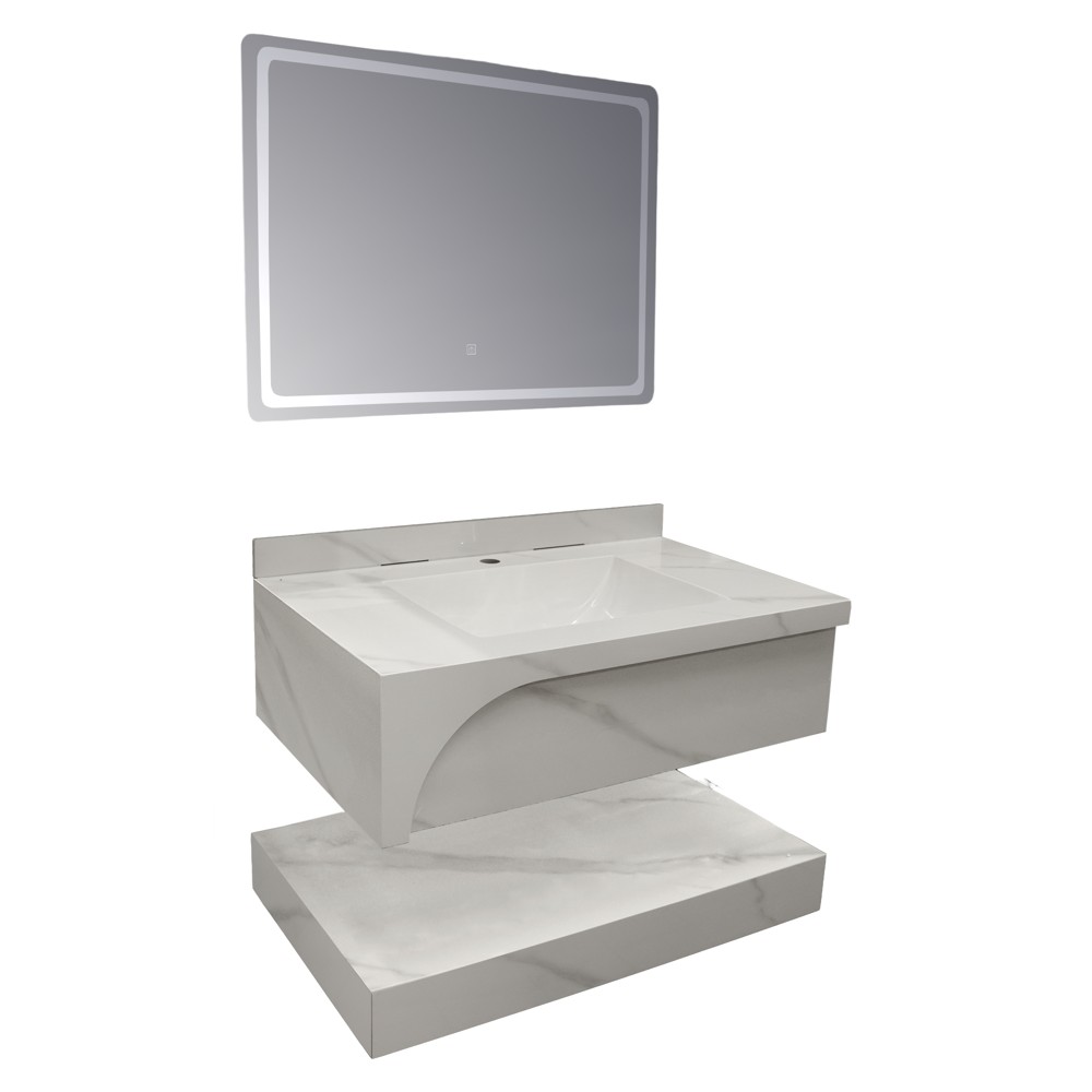 Set mobilje tualeti me montim në mur, i ndërtuar nga material gur i sintetizuar, duke ofruar një strukturë të qëndrueshme dhe rezistente ndaj lagështirës. Me përmasa W 80 cm x D 50 cm x H 23 cm dhe ngjyrë të bardhë të pastër, ky set është i përshtatshëm për çdo hapësirë, duke ofruar funksionalitet dhe një pamje moderne. Pasqyra LED ka përmasa W 80 cm x H 60 cm, dhe është projektuar për t'u integruar në mënyrë të përshtatshme me bangon, duke krijuar një pamje të pastër dhe të organizuar. Gjithashtu hapësira midis dy bangove mund të përdoret për të organizuar peshqirë, ose elementë të tjerë të domosdoshëm në tualet. Ky dizajn i montuar në mur kursen hapësirë dhe lehtëson pastrimin e zonës poshtë bangos, duke kontribuar në një ambient tualeti më të pastër dhe më të rregullt.