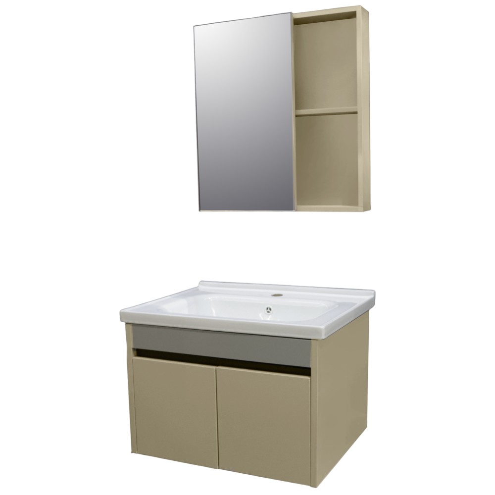 Ky set mobilje tualeti me montim në mur është i ndërtuar nga material PVC, duke ofruar një strukturë të qëndrueshme dhe rezistente ndaj lagështirës. Me përmasa W 60 cm x D 46 cm x H 40 cm,dhe ngjyrë pana, ky set është i përshtatshëm për çdo hapësirë, duke ofruar funksionalitet dhe estetikë moderne. Pasqyra përkatëse ka përmasa W 55 cm x D 11 cm x H 60 cm, dhe është projektuar për t'u integruar në mënyrë të përshtatshme me kabinetin, duke krijuar një pamje të pastër dhe të organizuar. Ky dizajn i montuar në mur kursen hapësirë dhe lehtëson pastrimin e zonës poshtë kabinetit, duke kontribuar në një ambient tualeti më të pastër dhe më të rregullt.
