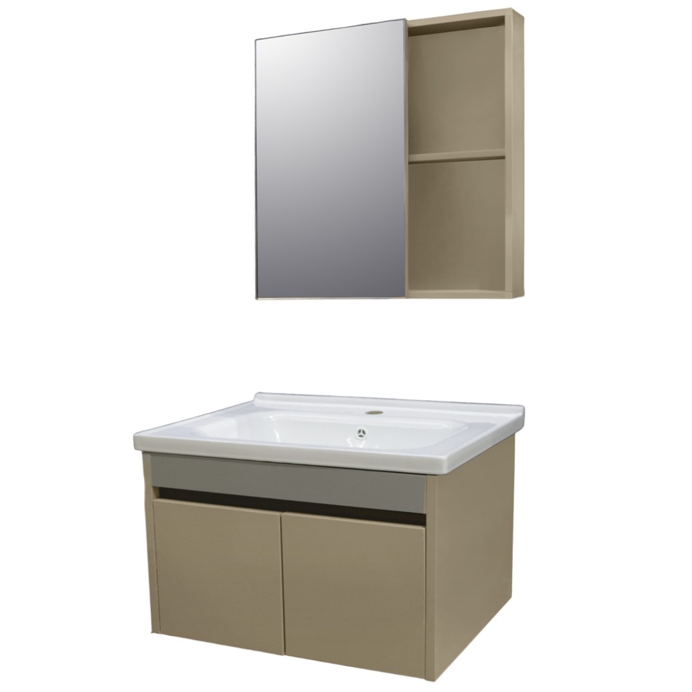 Ky set mobilje tualeti me montim në mur është i ndërtuar nga material PVC, duke ofruar një strukturë të qëndrueshme dhe rezistente ndaj lagështirës. Me përmasa W 80 cm x D 46 cm x H 40 cm,dhe ngjyrë pana, ky set është i përshtatshëm për çdo hapësirë, duke ofruar funksionalitet dhe estetikë moderne. Pasqyra përkatëse ka përmasa W 75 cm x D 11 cm x H 60 cm, dhe është projektuar për t'u integruar në mënyrë të përshtatshme me kabinetin, duke krijuar një pamje të pastër dhe të organizuar. Ky dizajn i montuar në mur kursen hapësirë dhe lehtëson pastrimin e zonës poshtë kabinetit, duke kontribuar në një ambient tualeti më të pastër dhe më të rregullt.