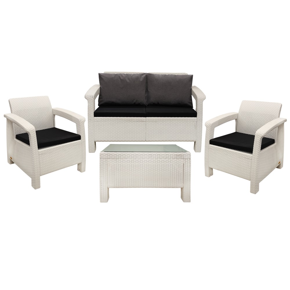 Set Novara 2 kolltuk tek + 1 kolltuk dopjo + 1 tavolinë mesi, ratan plastik, ngjyre e bardhe, teku 75x70x79cm, dopjo 128x70x79cm, tavolina 77x57x42cm