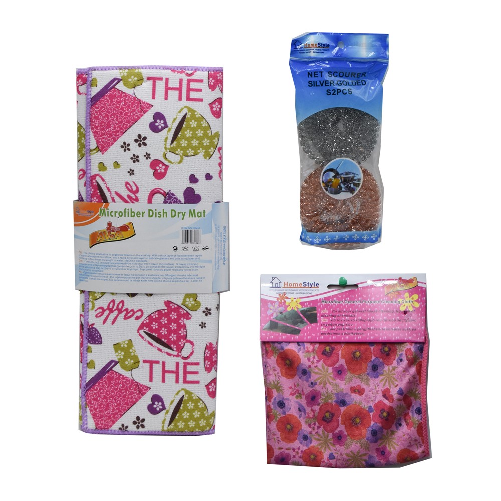 Set pastrimi kuzhine, i cili përmban një pecetë pastrimi kuzhine, një tel enësh dhe një pecetë mikrofibër. Teli i enëve përdoret për të eliminuar me lehtësi mbetjet e vështira të ushqimit nga sipërfaqet e enëve. Materiali përbërës i pecetave ka veti të larta përthithëse, mbledh me lehtësi pluhurat, si edhe është i butë dhe nuk lë shenja në sipërfaqet e ndryshme gjatë pastrimit. Ky produkt është praktik në përdorim dhe mund të pastrohet lehtësisht.