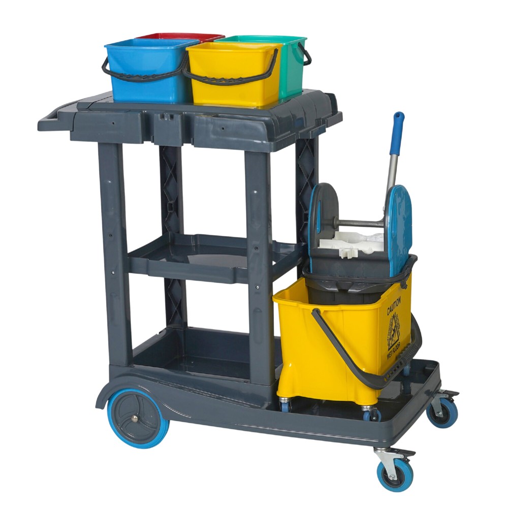 Kovë profesionale për pastrimin e ambjenteve me sipërfaqe të madhe. Set i pastrimit përmban aksesorët e nevojshëm për një pastrim efikas. Është e prodhuar nga bazament i qëndrueshëm i plastikës dhe me strukturë metalike me rezistencë të lartë. E pajisur me 4 kova- 4x5 Lt dhe 1 x25 Lt, ndarja fundore mban kovën e cila përdoret për larje të dyshemesë, e pajisur dhe me shtrydhëse plastike me dorezë metalike, katet e tjera jane opsionale ku mund të vendosësh pecetat e pastrimit, larësit, sfungjerët apo cdo aksesor tjetër e domosdoshme për një pastrim sa me të mirë. Kati i sipërm përmban 4 kova të cilat dhe kto janë opsionale nga përdoruesi, mund të mbushen me ujë të pastër apo të vendosesh aksësorë të tjerë pastrimi. Falë transportuesit dhe pajisjes me rrota levizja e saj është tepër e lehtë.
