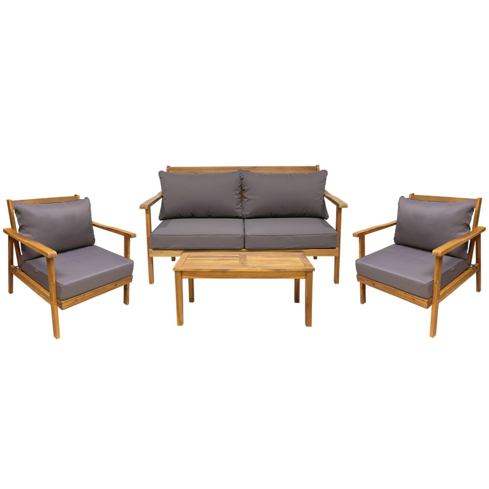 Ky set për ambient të jashtëm është dizajnuar për të ofruar komoditet dhe stil në hapësirat e jashtme. I ndërtuar nga dru tropikal Acacia, i njohur për qëndrueshmërinë dhe rezistencën ndaj kushteve atmosferike, ky set përfshin dy kolltukë të vegjël dhe një kolltuk dy-vendësh, të cilët ofrojnë një kombinim të përshtatshëm për relaksim dhe biseda. Kolltuku i vogël (tek) ka përmasa 82x78.5xH83 cm dhe është ideal për përdorim individual, duke ofruar një ndjesi të rehatshme dhe të qetë për çdo moment. Kolltuku dy-vendësh ka përmasa 152x78.5xH65 cm, dhe ofron hapësirë të bollshme për të shijuar biseda ose për t'u relaksuar me një mik, duke e bërë atë një pjesë të shkëlqyer për çdo ambient të jashtëm. Tavolina shoqëruese e këtij seti ka përmasa 90x45xH42 cm, dhe është perfekte për të vendosur pije, ushqime apo dekorata, duke plotësuar stilin dhe funksionalitetin e setit.