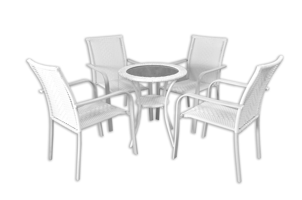 Seti i ratanit me thurje, i përbërë nga tavolina me syprinën e xhamit të temperuar si dhe katër karriget, është një zgjedhje ideale për të mobiluar ambientet e hapura të bareve, verandave, tarracave, ballkoneve etj. Skeleti metalik që siguron qendrueshmërinë dhe jetëgjatësinë e këtij seti është veshur me materialin e ratanit prej polietileni (PE), i cili është i lehtë. Forma mjaft elegante dhe gjeometrike e këtij seti me thurje te këndshme gjatësore në pjesën e mbështetjes dhe uljes së karrigeve si dhe në syprinën e tavolinës, shtojnë hijeshinë e tij duke e bërë lehtësisht të përshtatshëm për ambientet moderne të kopshtit tuaj. Ngjyra e bardhë e këtij seti përshtatet lehtë me të gjitha nuancat e ngjyrave veçanërisht me ngjyra të forta të aksesorëve të kopshtit tuaj dhe mjaft mirë me ambientet e gjelbëruara, duke krijuar kontrast harmonik dhe mjaft estetik.