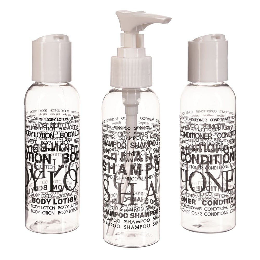 Set shishesh transparente, për shampo, balsam dhe locion për trupin, prej materiali plastik të tejdukshëm. Përdoren për të ruajtur me kujdes produkte të ndryshme të kujdesit personal dhe janë të përshtatshme dhe praktike për udhëtime të gjata. Seti përmban 1 shishe sprai dhe 2 shishe normale.