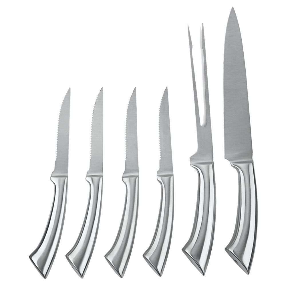 Kompleti thikash me 6 pjesë Napoleon 55206 PRO ofron një grup thikash me cilësi të lartë. Çdo thikë përmban një konstruksion çeliku inox pa probleme për të siguruar një produkt afatgjatë dhe të qëndrueshëm dhe një ekuilibër të përsosur, ndërsa seti (6) pjesë përfshin një thikë kuzhinieri, pirun gdhendjeje dhe (4) thika bifteku.