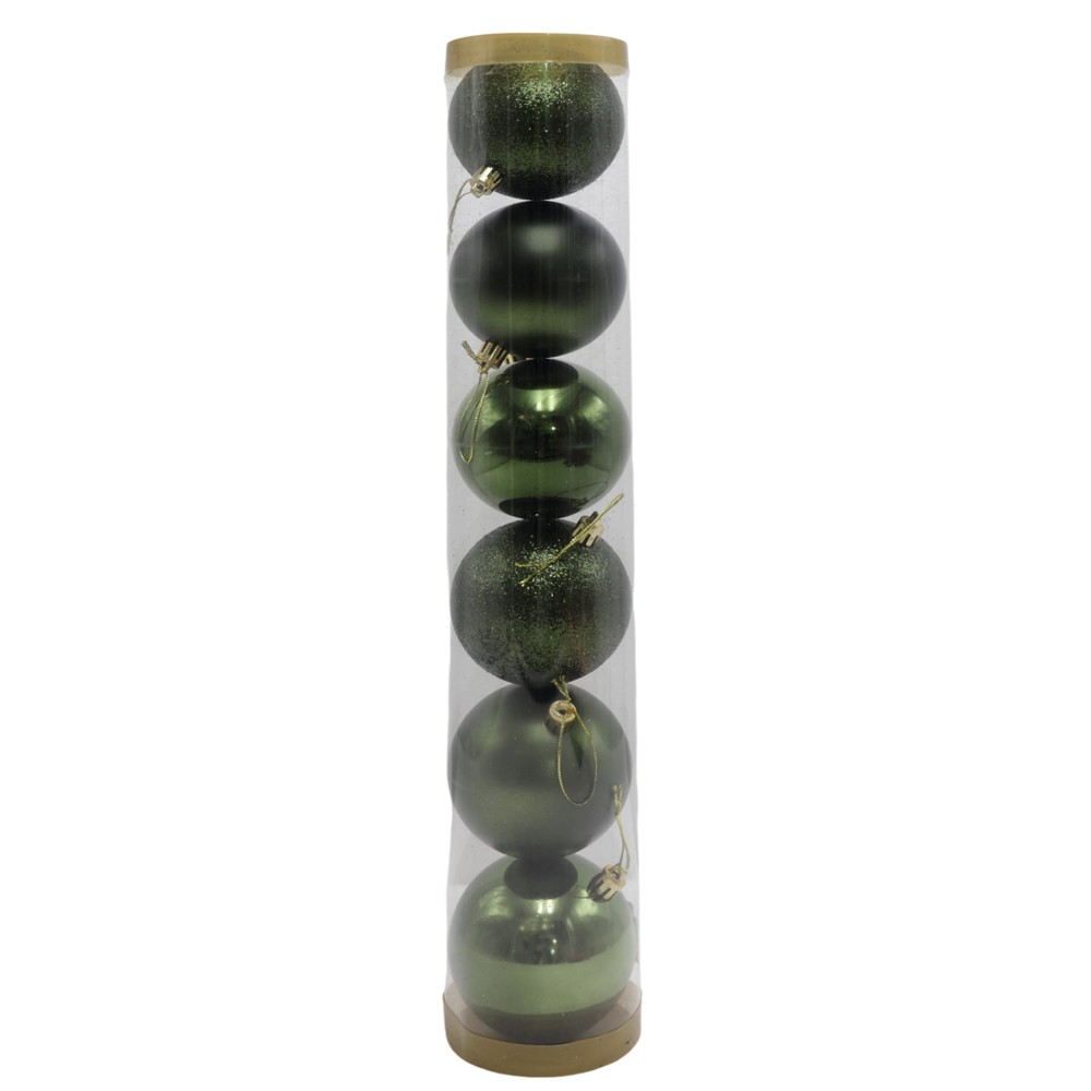 Christmas baubless (pk 6), plastic, dark green, 3 models, 8 cm