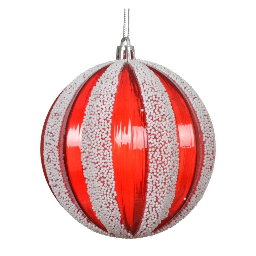 Sfere dekoruese, plastike, ngjyre semitransparente, e kuqe me te bardhe, D 8 cm