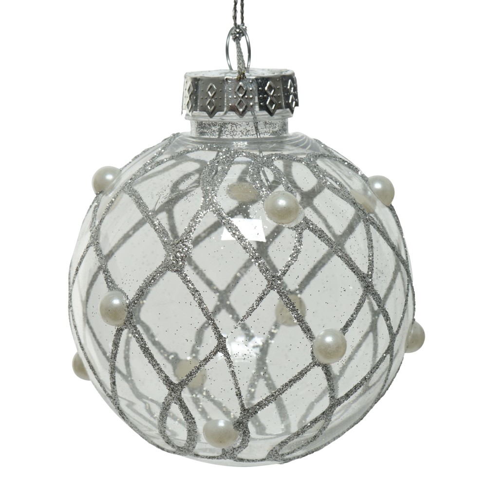 Sferë dekoruese prej qelqi ngjyrë transparente me diametër 10 cm. Ky aksesor dekorues përdoret për të zbukuruar pemen e vitit të ri, duke i shtuar magjinë e festave ambjenteve tuaja festive të fundvitit.