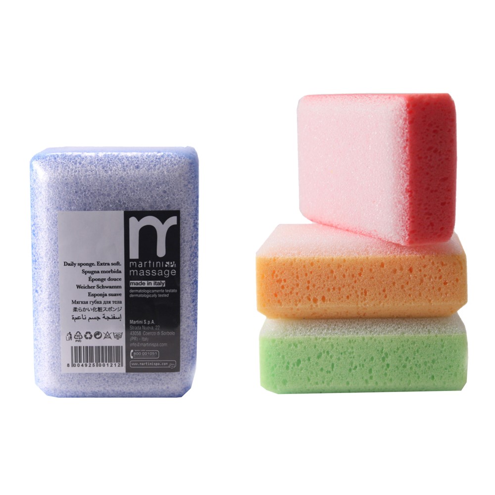 Sfungjer dushi masazhues, Martini. Ana e butë e sfungjerit pastron trupin, ana me një sipërfaqe të veçantë masazhi ushtron një veprim scrub që zbut dhe tonifikon lëkurën.