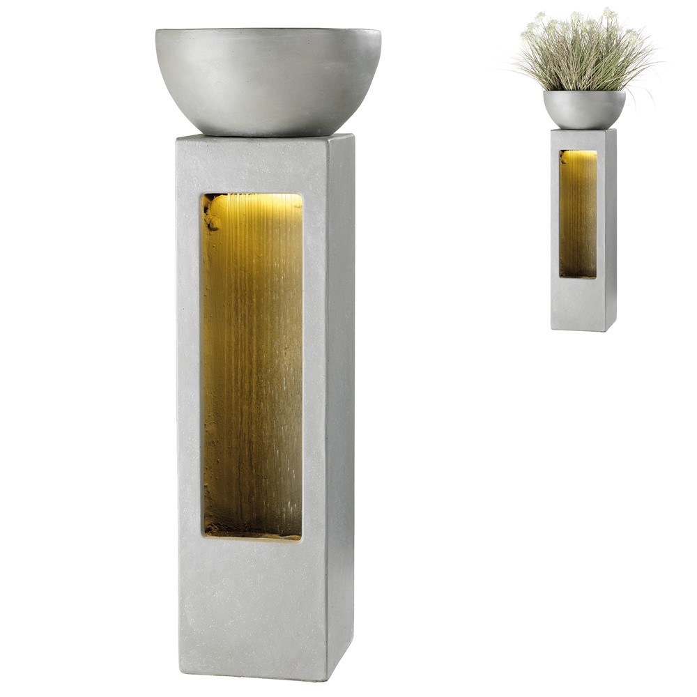 Shatërvane me cimento te perforcuar me fibra xhami, 40 x 40, H113.5 cm, gri, me ndricim led. Kanë pamjen e gurit natyror. Për t'i shtuar një element relaksues dhe të bukur mjediseve tuaja dhe per te sjelle natyren prane jush zgjidhja eshte ky shatervan. Mund të vendosen brenda ose jashtë.