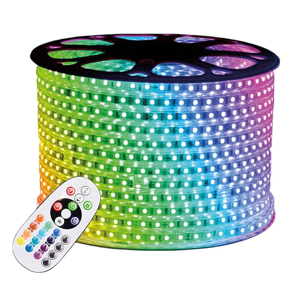 Shirit LED RGB, 10W/m, me tension 220V. Diametri 16 mm dhe mbrojtje IP54 kundër pluhurit dhe ujit. Ideal për ndriçim dekorativ me ngjyra të ndryshme në ambiente të brendshme dhe të jashtme me lagështirë të kontrolluar.