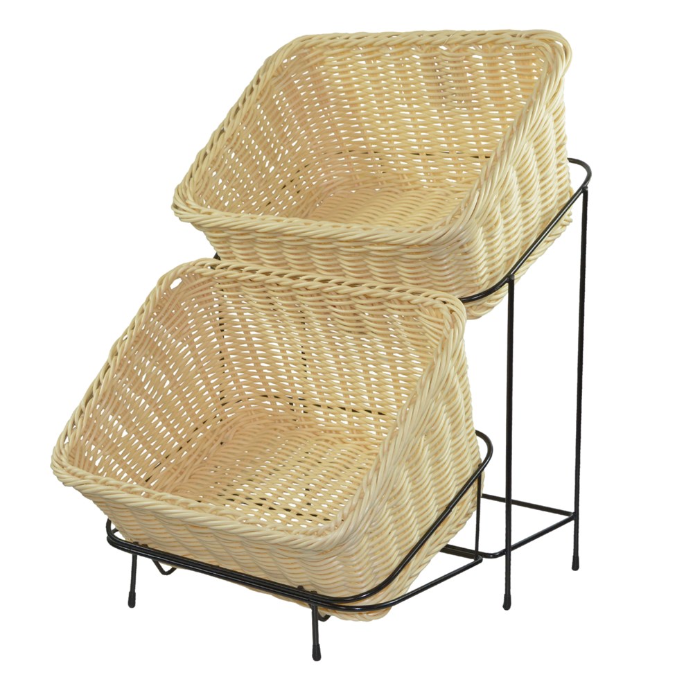 Seti me dy kate 34x24x11/18 cm I perbre nga shoprta higjenike prej materiali sintetik me nje ngjyre natyrale shume te pranueshme dhe qe duket mjaft bukur per prezantimin e ushqimeve ne mengjesin e hoteleit tuaj, si dhe ne prezentimin e embeliserave apo te bukes se ngrohte.me nje stende te qendrueshme metalike kjo stende eshte shume praktike pasi eshte lehtesisht e manovrueshme. Per nje ambient te rregullt dhe te organizuar ky set shportash eshte aksesori i duhur.