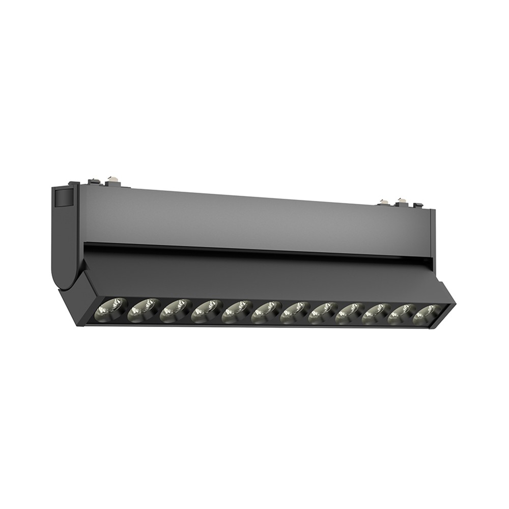 Spot linear për shine magnetike, 48V, 12W, me ngjyrë drite 4000K (e bardhë natyrale) dhe kënd të përcaktuar të dritës. Trup i zi, dizajn modern dhe i përshtatshëm për ndriçim të fokusuar në ambiente zyre, dyqan apo ekspozita.