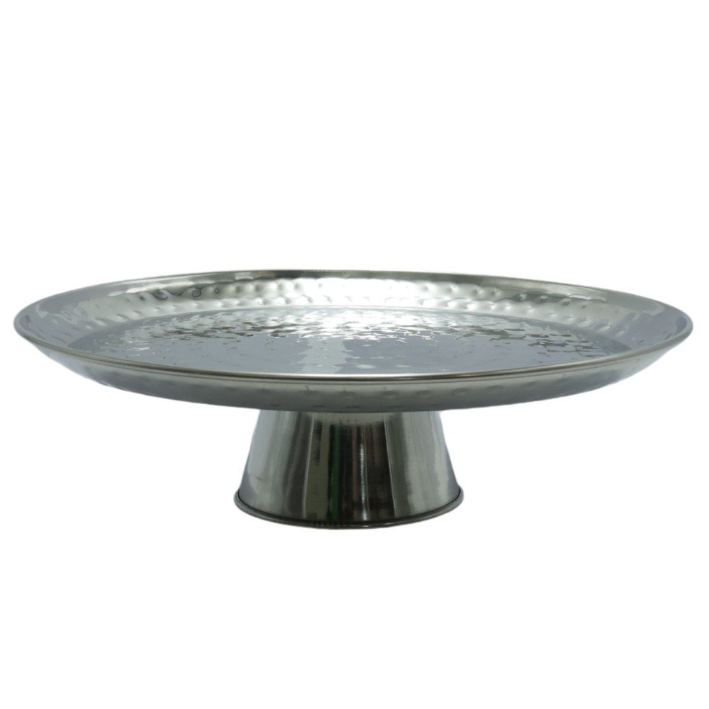 Stendë keku/torte prej inoksi në ngjyrë argjendi me një dizajn unik. Ideale për të vendosur tortën apo ëmbëlsirat tuaja në çdo rast festiv apo të përditshëm.Përmasat 26 x H. 8 cm e bejne kete te fundit te aksesueshme dhe shume te thjeshte per tu ruajtur.
