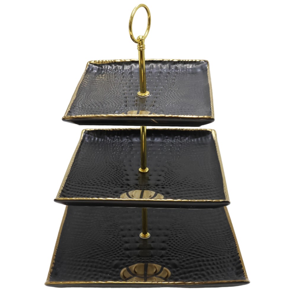 Stendë me tre kate, e realizuar nga qeramika në ngjyrën e zezë, me dimensionet 20x30 cm. Ky produkt ofron një zgjedhje të stilizuar për të ekspozuar dhe servirur ushqime apo ëmbëlsira në një mënyrë të organizuar.