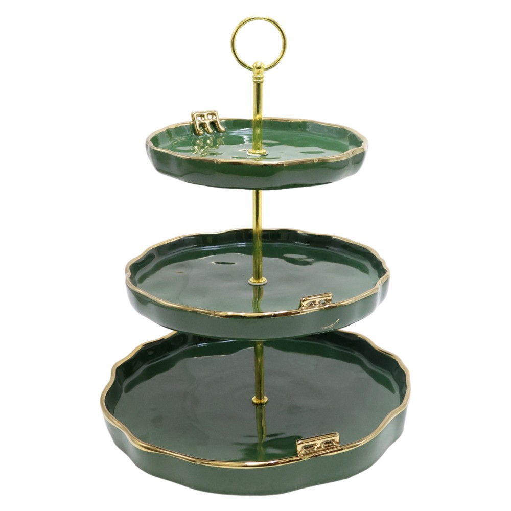 Stendë me tre kate, e realizuar nga qeramika në ngjyrën jeshile, me diametrin 30 cm. Ky produkt ofron një zgjedhje të stilizuar për të ekspozuar dhe servirur ushqime apo ëmbëlsira në një mënyrë të organizuar.