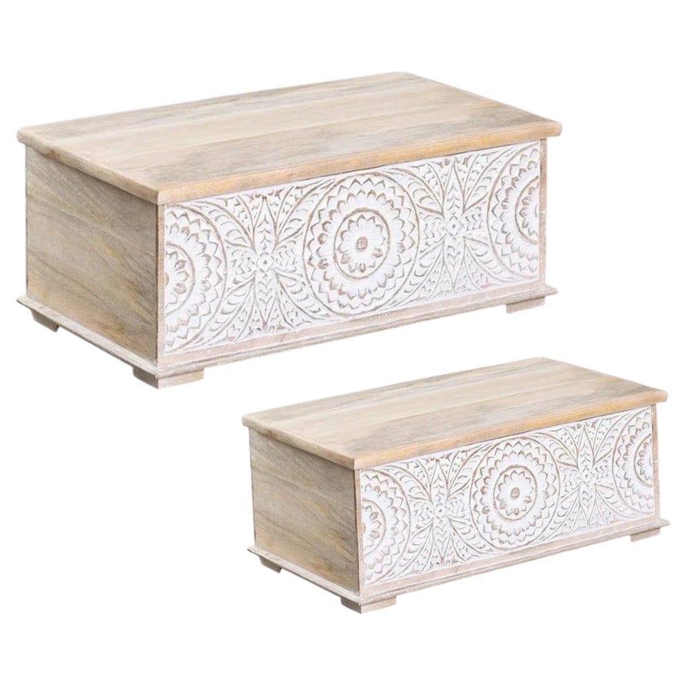 Sunduk dekorues set, i krijuar nga material druri i bardhë, është një zgjedhje e shkëlqyer për të shtuar një prekje të veçantë dhe funksionale në ambientin tuaj. Sunduku i vogël: Me dimensionet 60x33xH38 cm, ofron një hapësirë të përmasave të përshtatshme për të mbajtur objekte të vogla, si mbishkrimet, letërsinë e vjetër, apo sende të tjera dekorative. Sunduku i madh: Me dimensionet 78x42xH46 cm, ky sunduk ofron një hapësirë më të gjerë për të mbajtur objekte më të mëdha, si batanije, jastëkë, ose edhe rroba të shtëpisë.