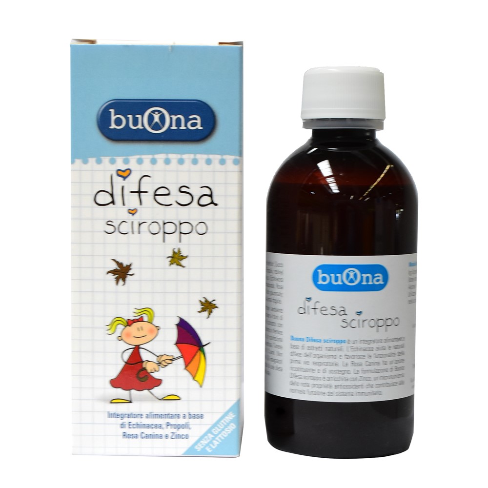Suplement ushqimor me baze ekstraktet bimore. Ekinace ndihmon ne mbrojtjen natyrale te trupit dhe favorizon funksionin e traktit respirator. Rosa Canina (trendafili i eger) ka nje veprim rigjenerues dhe suportues. Formulimi i Buona Difesa Shurup eshte i pasur me Zink, nje mineral qe nepermjet efektit antioksidues kontribuon ne funksionimin natyral te sistemit imunitar. Menyra e perdorimit: 3-6 vjec 5 ml, 7 - 10 vjec 7.5 ml, mbi 10 vjec-10 ml.