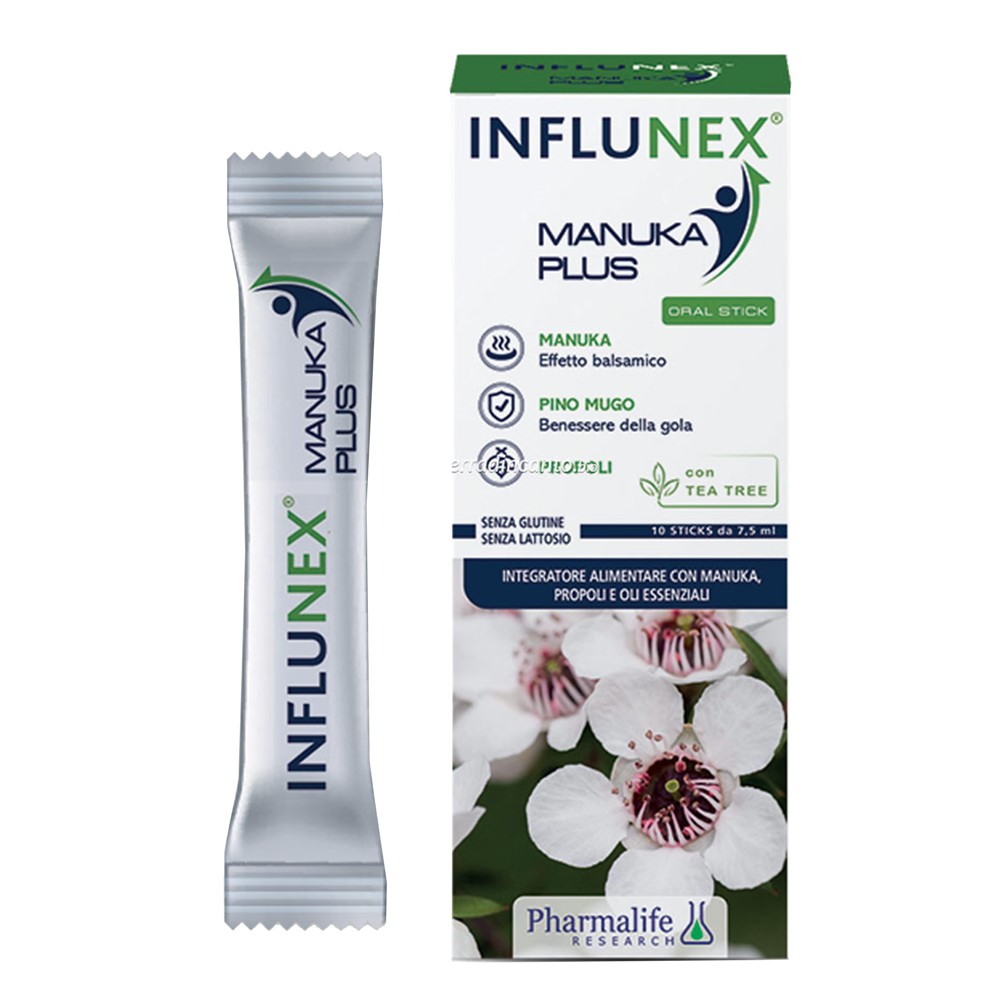 Suplement ushqimor, në formë bustinash, për trajtimin e inflamacionit të fytit, Influnex Manuca Plus