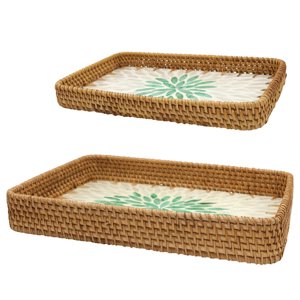 Tabakaja dekoruese me material kashte dhe sipërfaqe xhami është një objekt me funksionalitet të lartë që do të shërbejë edhe si një element dekorues. Ju do të keni një aksesor me një prekje elegante dhe me një ndërthurje ngjyrash unike. Kombinimi i materialit dhe dizenjos e bëjën atë një pjesë unike të dekorit tuaj. Por po ashtu ju mund të realizoni edhe kopozime të ndryshme me këtë set tabakash. Dizanji me gjethe e bën atë të duket shumë këndshëm me çdo lloj stili. Funksionale dhe elegante, vijnë në përmasat 33x24xH4.5 cm dhe 28x18xH4 cm. Mund ta përdorni jo vetëm në aspektin dekorues por edhe mund të shërbeni më të. E kuruar deri në detaje dhe me një stil unik që do të sjellë freski në ambientet tuaja.